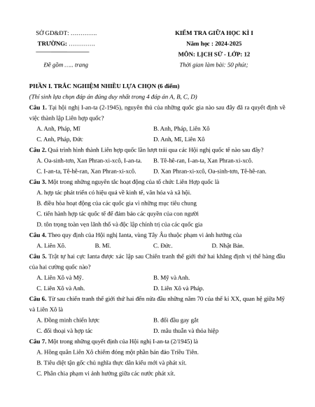 Câu 1. Tại hội nghị I-an-ta (2-1945), nguyên thủ của những quốc gia nào sau đây đã ra quyết định về