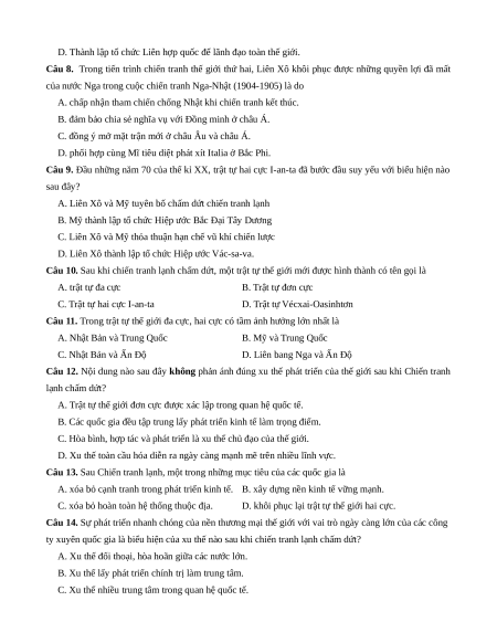 Câu 10. Sau khi chiến tranh lạnh chấm dứt, một trật tự thế giới mới được hình thành có tên gọi là A. trật tự đa cực B. Trật tự đơn cực