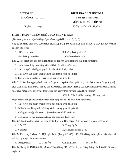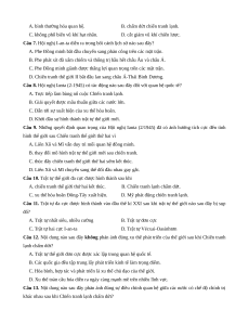 Câu 1. Tổ chức Liên hợp quốc được thành lập trong bối cảnh nhân dân thế giới ý thức sâu sắc về hậu quả tàn khốc của A. chiến tranh lạnh B. khủng hoảng kinh tế C. phân hóa giàu nghèo D. chiến tranh thế giới