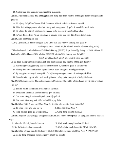 Câu 15. Nội dung nào sau đây không phản ánh đúng đặc điểm của trật tự thế giới đa cực trong quan hệ quốc tế?