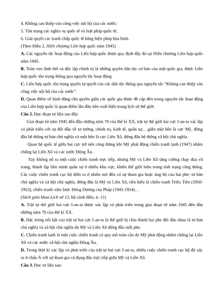 Câu 3. Nội dung nào sau đây vừa là nguyên tắc hoạt động của Liên hợp quốc, vừa là nguyên tắc của Việt
