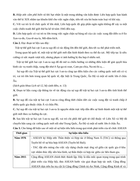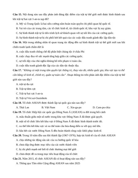 Câu 19. Tổ chức Hiệp hội các quốc gia Đông Nam Á (ASEAN) ra đời trong bối cảnh