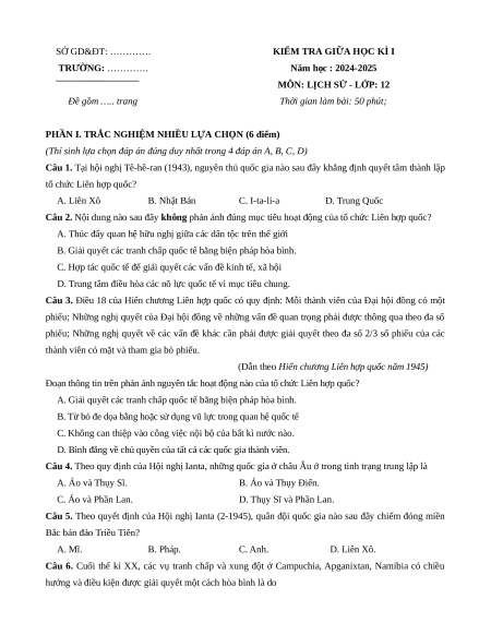 Câu 4. Theo quy định của Hội nghị Ianta, những quốc gia ở châu Âu ở trong tình trạng trung lập là A. Áo và Thụy Sĩ. B. Áo và Thụy Điển. C. Áo và Phần Lan. D. Thụy Sĩ và Phần Lan.