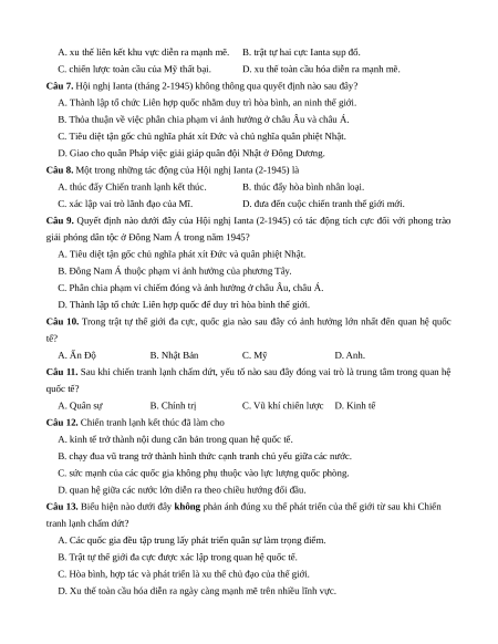 Câu 10. Trong trật tự thế giới đa cực, quốc gia nào sau đây có ảnh hưởng lớn nhất đến quan hệ quốc tế? A. Ấn Độ B. Nhật Bản C. Mỹ D. Anh.