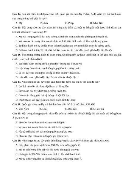 Câu 14. Sau khi chiến tranh lạnh chấm dứt, quốc gia nào sau đây ở châu Á đã vươn lên trở thành một