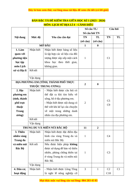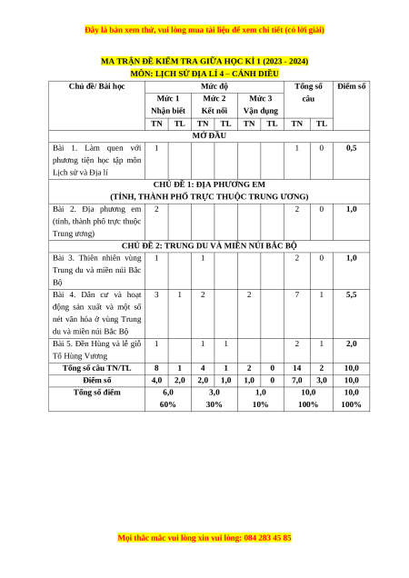 MÔN: LỊCH SỬ ĐỊA LÍ 4 – CÁNH DIỀU Chủ đề/ Bài học Mức độ Tổng số Điểm số Mức 1 Mức 2 Mức 3 câu Nhận biết Kết nối Vận dụng TN TL TN TL TN TL TN TL MỞ ĐẦU Bài 1. Làm quen với 1 1 0 0,5