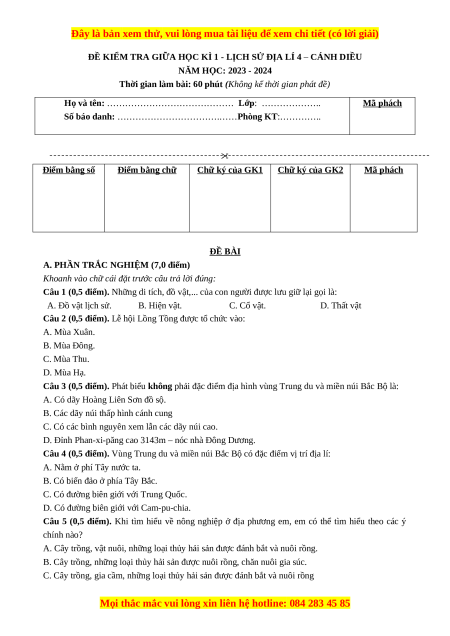 ĐỀ KIỂM TRA GIỮA HỌC KÌ 1 - LỊCH SỬ ĐỊA LÍ 4 – CÁNH DIỀU NĂM HỌC: 2023 - 2024