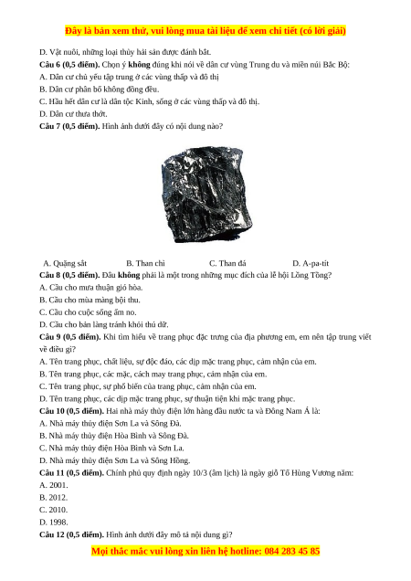 Câu 6 (0,5 điểm). Chọn ý không đúng khi nói về dân cư vùng Trung du và miền núi Bắc Bộ: