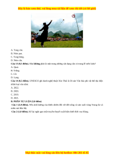 Câu 14 (0,5 điểm). UNESCO ghi danh nghệ thuật Xòe Thái là Di sản Văn hóa phi vật thể đại diện nhân loại vào năm: A. 2022. B. 2020. C. 2019. D. 2021.