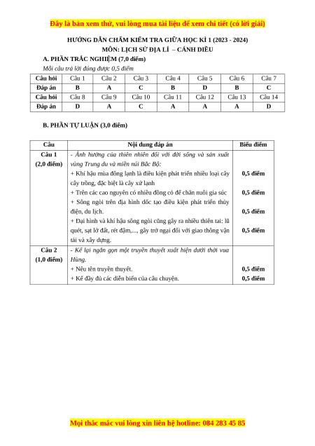 HƯỚNG DẪN CHẤM KIỂM TRA GIỮA HỌC KÌ 1 (2023 - 2024)