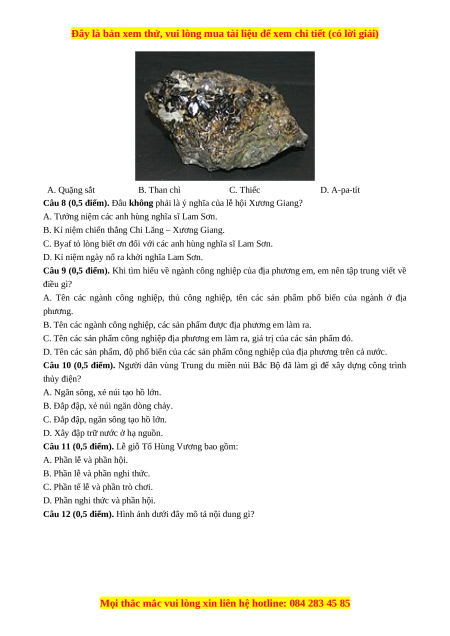 Câu 8 (0,5 điểm). Đâu không phải là ý nghĩa của lễ hội Xương Giang?
