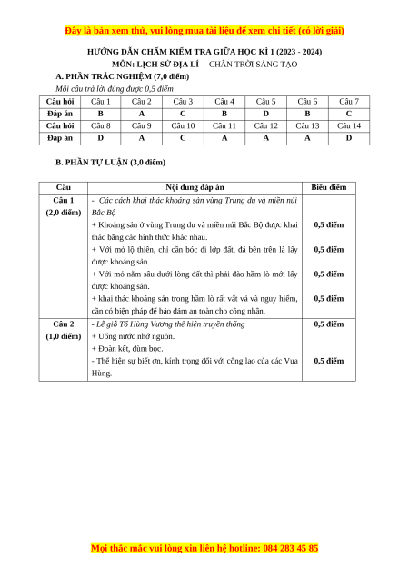 HƯỚNG DẪN CHẤM KIỂM TRA GIỮA HỌC KÌ 1 (2023 - 2024)