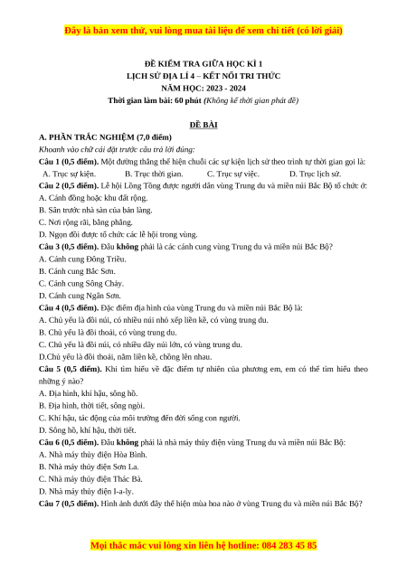 Câu 1 (0,5 điểm). Một đường thẳng thể hiện chuỗi các sự kiện lịch sử theo trình tự thời gian gọi là: A. Trục sự kiện. B. Trục thời gian. C. Trục sự việc. D. Trục lịch sử.