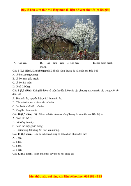 Câu 8 (0,5 điểm). Đâu không phải là lễ hội vùng Trung du và miền núi Bắc Bộ? A. Lễ hội Xương Giang.