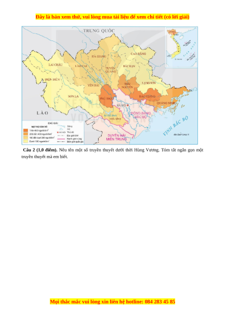 Câu 2 (1,0 điểm). Nêu tên một số truyền thuyết dưới thời Hùng Vương. Tóm tắt ngắn gọn một