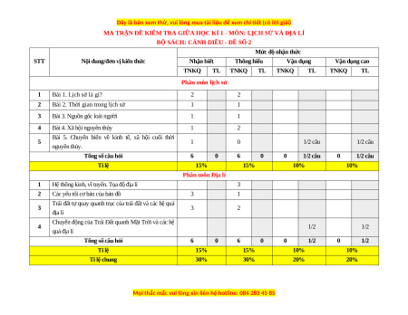 MA TRẬN ĐỀ KIỂM TRA GIỮA HỌC KÌ 1 - MÔN: LỊCH SỬ VÀ ĐỊA LÍ
