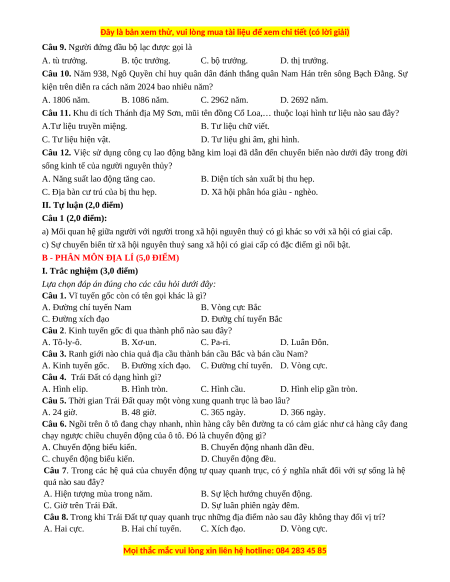 Câu 9. Người đứng đầu bộ lạc được gọi là A. tù trưởng. B. tộc trưởng. C. bộ trưởng. D. thị trưởng.