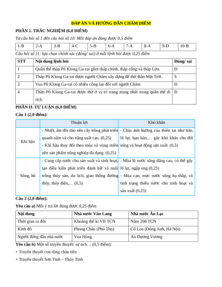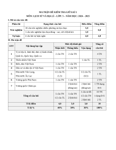 Dân cư và dân tộc ở Việt Nam 1 câu TN 1 câu TN 2 TN Nhà nước Văn Lang, 1/2 câu TL 1/2 câu TL 5 1 TL Nhà nước Âu Lạc (1,5) (0,5) 6 Vương quốc Phù Nam 1 câu TN 1 câu TN 2 TN 2 lệnh hỏi 2 lệnh hỏi 1 TN dạng 7 Vương quốc Chăm-pa (đúng/sai) (đúng/sai) Đ-S 1 câu sơ đồ 10 TN 5 câu TN 5 câu TN Tổng số câu hỏi 1/2 câu TN 1 dạng Đ-S 1/2 câu TL 2 lệnh hỏi 2 lệnh hỏi 2 TL Tỉ lệ điểm 4,0 3,0 3,0 10 Tỉ lệ % 40% 30% 30% 100%