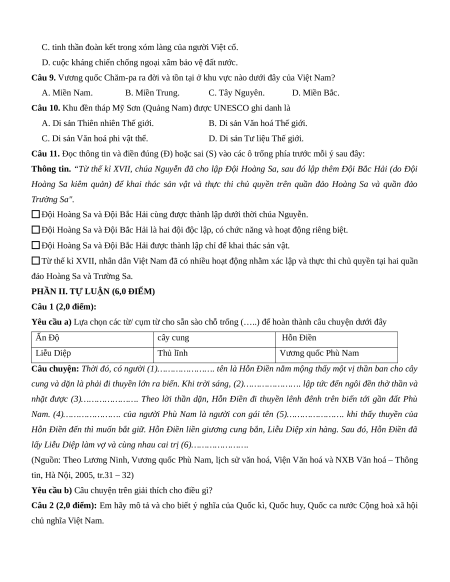 Câu 9. Vương quốc Chăm-pa ra đời và tồn tại ở khu vực nào dưới đây của Việt Nam? A. Miền Nam. B. Miền Trung. C. Tây Nguyên. D. Miền Bắc.