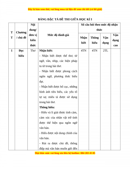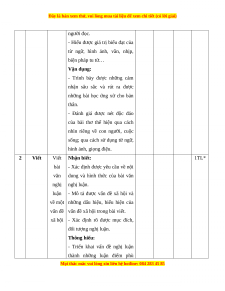 Nhận biết Thông hiểu Vận dụng % T năng cao điểm TN TL TN TL TN TL TN TL Đọc 1 Thơ 4 0 4 0 0 2 0 0 60 hiểu Viết bài văn nghị luận về 2 Viết 0 1* 0 1* 0 1* 0 1* 40 một vấn đề xã hội Tổng 20 5 20 15 0 30 0 10 Tỉ lệ % 25% 35% 30% 10% 100% Tỉ lệ chung 60% 40%