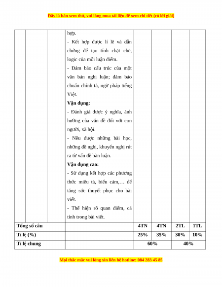 - Thể hiện rõ quan điểm, cá tính trong bài viết. Tổng số câu 4TN 4TN 2TL 1TL Tỉ lệ (%) 25% 35% 30% 10% Tỉ lệ chung 60% 40%