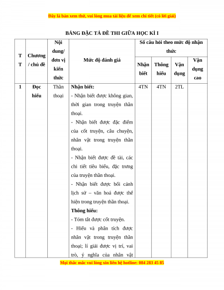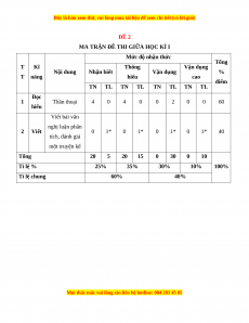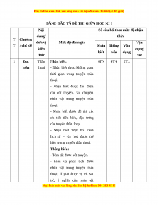 Mức độ nhận thức Tổng T Kĩ Thông Vận dụng Nội dung Nhận biết Vận dụng % T năng hiểu cao điểm TN TL TN TL TN TL TN TL Đọc 1 Thần thoại 4 0 4 0 0 2 0 0 60 hiểu Viết bài văn nghị luận phân 2 Viết 0 1* 0 1* 0 1* 0 1* 40 tích, đánh giá một truyện kể Tổng 20 5 20 15 0 30 0 10 Tỉ lệ % 25% 35% 30% 10% 100% Tỉ lệ chung 60% 40%