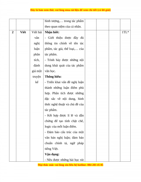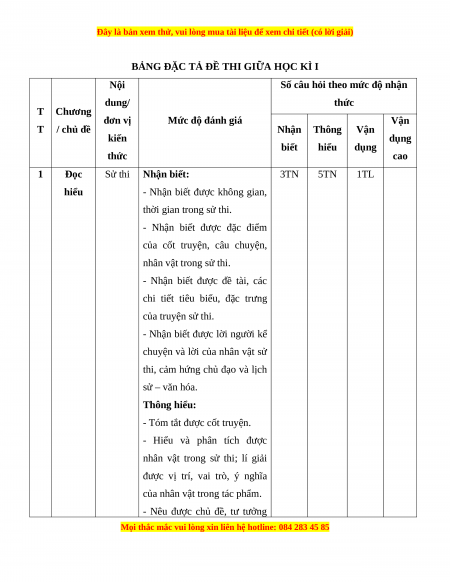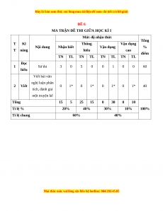 Mức độ nhận thức Tổng T Kĩ Thông Vận dụng Nội dung Nhận biết Vận dụng % T năng hiểu cao điểm TN TL TN TL TN TL TN TL Đọc 1 Sử thi 3 0 5 0 0 1 0 0 60 hiểu Viết bài văn nghị luận phân 2 Viết 0 1* 0 1* 0 1* 0 1* 40 tích, đánh giá một truyện kể Tổng 15 5 25 15 0 30 0 10 Tỉ lệ % 20% 40% 30% 10% 100% Tỉ lệ chung 60% 40%