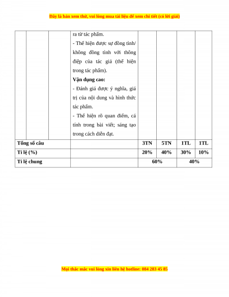 tính trong bài viết; sáng tạo trong cách diễn đạt. Tổng số câu 3TN 5TN 1TL 1TL Tỉ lệ (%) 20% 40% 30% 10% Tỉ lệ chung 60% 40%