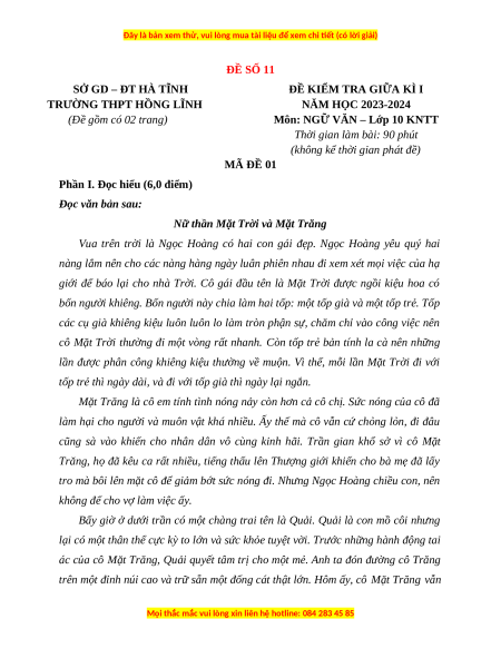 Đề thi giữa kì 1 Ngữ Văn 10 Kết nối tri thức (Đề 11)
