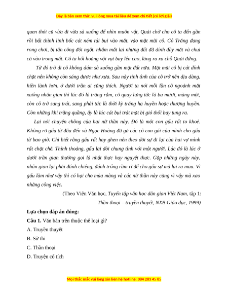 Câu 1. Văn bản trên thuộc thể loại gì? A. Truyền thuyết B. Sử thi C. Thần thoại D. Truyện cổ tích