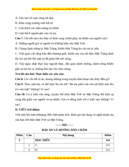 ĐÁP ÁN VÀ HƯỚNG DẪN CHẤM Phần Câu Nội dung Điểm I ĐỌC HIỂU 6.0 1 C 0.5 2 D 0.5