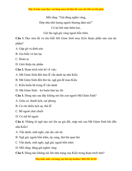 Câu 6. Dòng nào nói lên thân phận của Kiều trong đoạn trích trên?