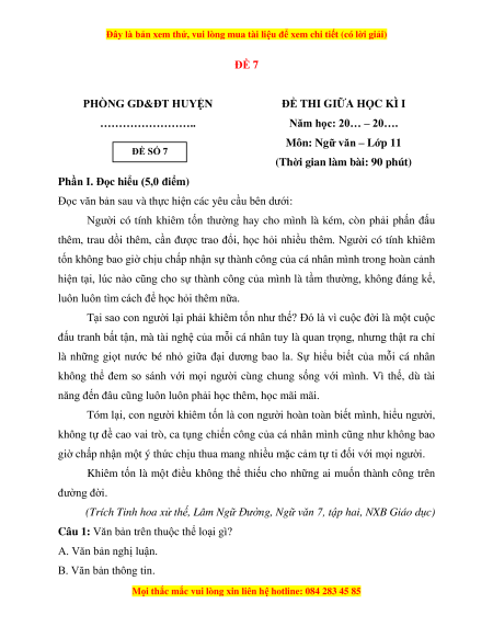 Môn: Ngữ văn – Lớp 11 ĐỀ SỐ 7