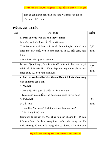 minh về chiếc nón lá có lồng ghép một hay nhiều yếu tố như miêu tả, tự sự, biểu cảm, nghị luận. HƯỚNG DẪN CHẤM