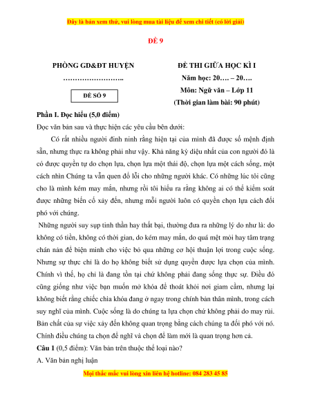 Môn: Ngữ văn – Lớp 11 ĐỀ SỐ 9