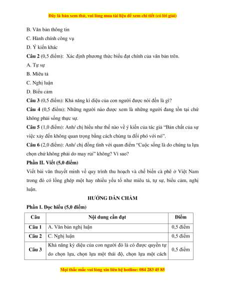 Câu 1 A. Văn bản nghị luận 0,5 điểm Câu 2 C. Nghị luận 0,5 điểm