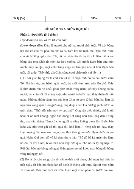 Mức độ nhận thức T Năng Mạch nội Tổng Vận dụng T lực dung Nhận biết Thông hiểu Vận dụng % cao Năng 1 lực Truyện ngắn 1 2 2 0 50 Đọc Viết bài văn Năng nghị luận so 2 lực sánh, đánh giá 1* 1* 1* 1* 50 Viết hai tác phẩm truyện Tổng 15 35 40 10 100 Tỉ lệ % 50% 50%