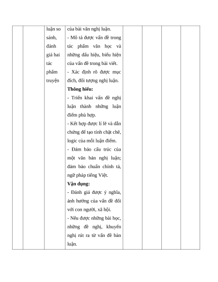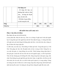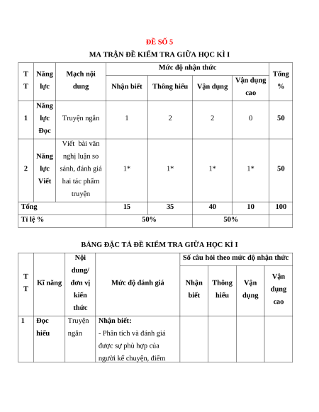 Mức độ nhận thức T Năng Mạch nội Tổng Vận dụng T lực dung Nhận biết Thông hiểu Vận dụng % cao Năng 1 lực Truyện ngắn 1 2 2 0 50 Đọc Viết bài văn Năng nghị luận so 2 lực sánh, đánh giá 1* 1* 1* 1* 50 Viết hai tác phẩm truyện Tổng 15 35 40 10 100 Tỉ lệ % 50% 50%