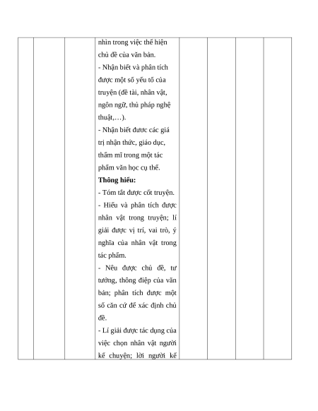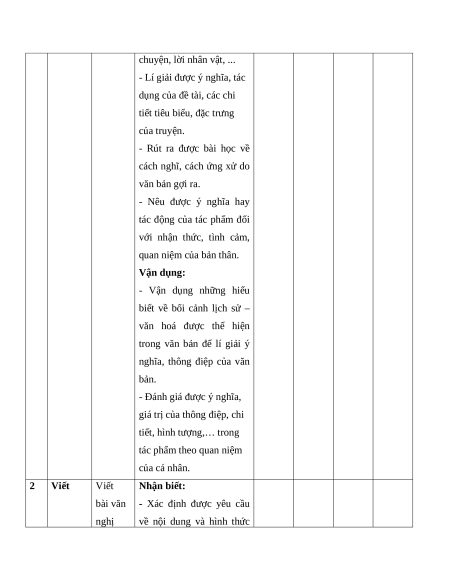 Số câu hỏi theo mức độ nhận thức dung/ T Vận Kĩ năng đơn vị Mức độ đánh giá Nhận Thông Vận T dụng kiến biết hiểu dụng cao thức 1 Đọc Truyện Nhận biết: hiểu ngắn - Phân tích và đánh giá