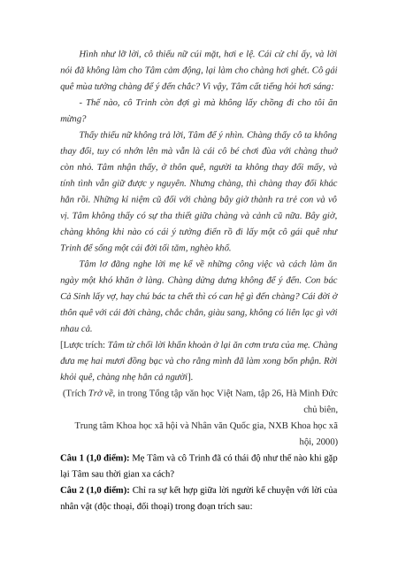 Câu 1 (1,0 điểm): Mẹ Tâm và cô Trinh đã có thái độ như thế nào khi gặp