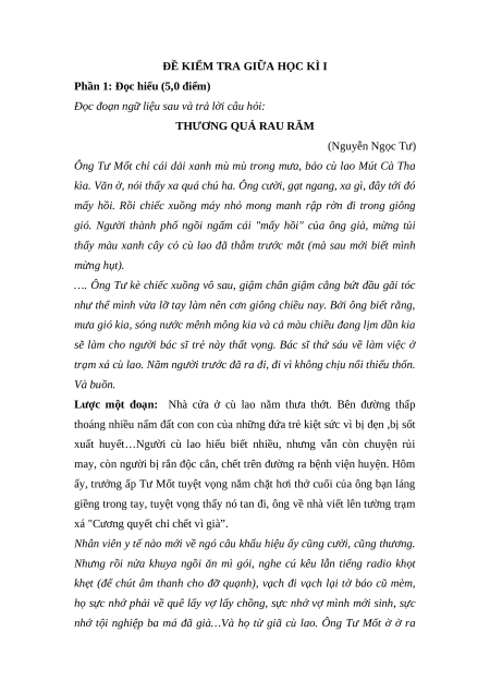 Phần 1: Đọc hiểu (5,0 điểm) Câu Đáp án Điểm 1 - Ngôi kể thứ 3. 1,0 điểm 2