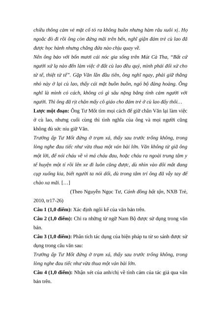 Câu 2 (1,0 điểm): Chỉ ra những từ ngữ Nam Bộ được sử dụng trong văn bản.