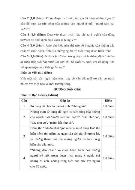 Phần 1: Đọc hiểu (5,0 điểm) Câu Đáp án Điểm 1