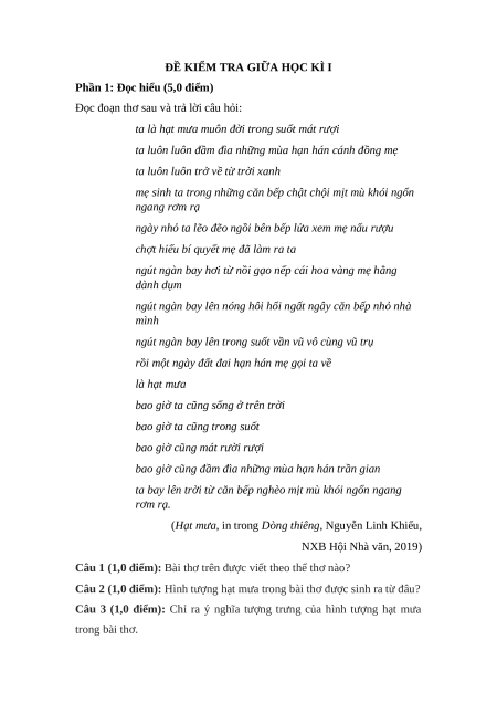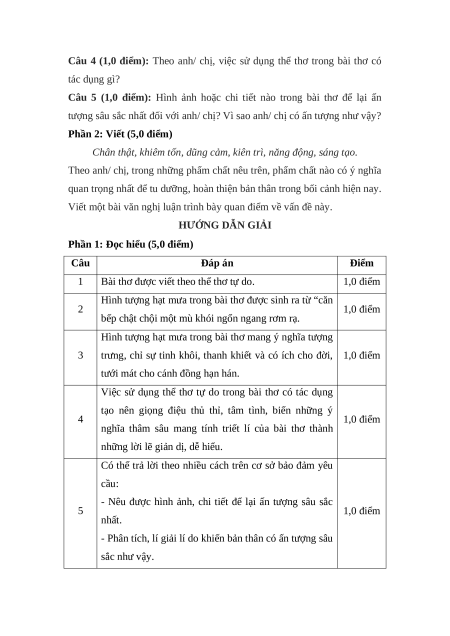 Câu 3 (1,0 điểm): Chỉ ra ý nghĩa tượng trưng của hình tượng hạt mưa trong bài thơ.