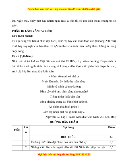 (Ngữ văn 12, Tập 1, NXB Giáo dục Việt Nam, 2018, tr. 100) HƯỚNG DẪN CHẤM Câ Nội dung Điểm Phần u I ĐỌC HIỂU 3,0 1