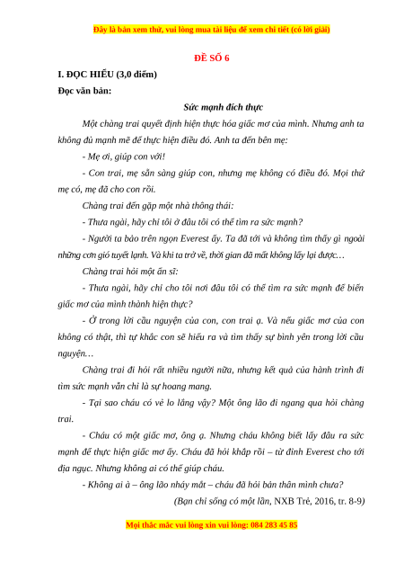 I. ĐỌC HIỂU (3,0 điểm) Đọc văn bản: