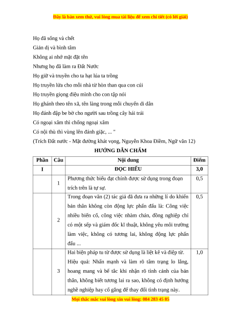 (Trích Đất nước - Mặt đường khát vọng, Nguyễn Khoa Điềm, Ngữ văn 12) HƯỚNG DẪN CHẤM Phần Câu Nội dung Điểm I ĐỌC HIỂU 3,0