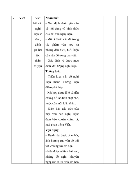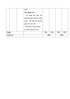 Mức độ nhận thức T Năng Mạch nội Tổng Vận dụng T lực dung Nhận biết Thông hiểu Vận dụng % cao Năng 1 lực Thơ 1 2 2 0 50 Đọc Viết bài văn Năng nghị luận so 2 lực sánh, đánh giá 1* 1* 1* 1* 50 Viết hai tác phẩm truyện Tổng 15 35 40 10 100 Tỉ lệ % 50% 50%