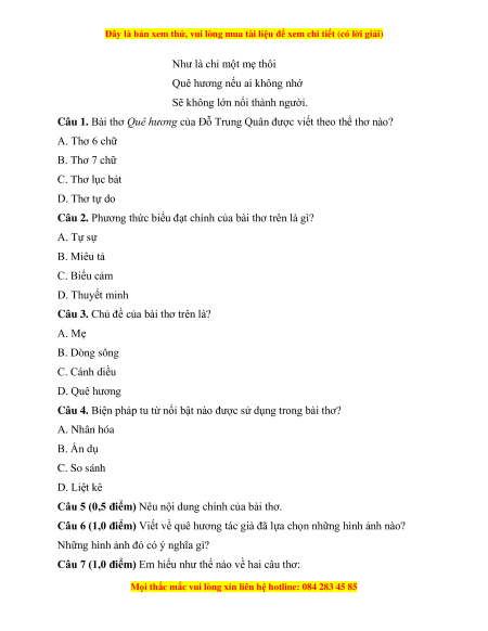 Câu 1. Bài thơ Quê hương của Đỗ Trung Quân được viết theo thể thơ nào? A. Thơ 6 chữ B. Thơ 7 chữ C. Thơ lục bát D. Thơ tự do