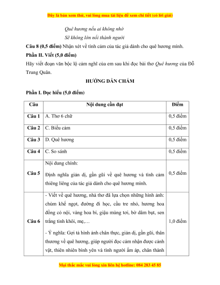 Nội dung cần đạt Điểm Câu 1 A. Thơ 6 chữ 0,5 điểm Câu 2 C. Biểu cảm 0,5 điểm Câu 3 D. Quê hương 0,5 điểm Câu 4 C. So sánh 0,5 điểm Nội dung chính:
